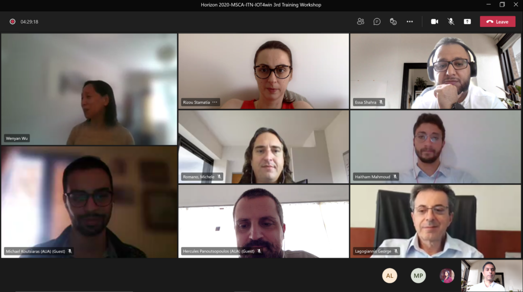 3rd Workshop for IoT4Win The third workshop for the IoT4Win project was held online via the Teams software. The project partners attended the workshop from the industrial United Utilities (UK) and Singlor Logic (Greece). In addition to the project representative Birmingham City University (BCU), UK. Four invited talkers gave presentations on Innovation Competition at United Utilities, Smart Technologies in Water System, AI-Based Analytics for Energy Management in Wate System, and Smart Farming Technologies. Moreover, the three ESRs presented their projects and the outputs achieved for each project.